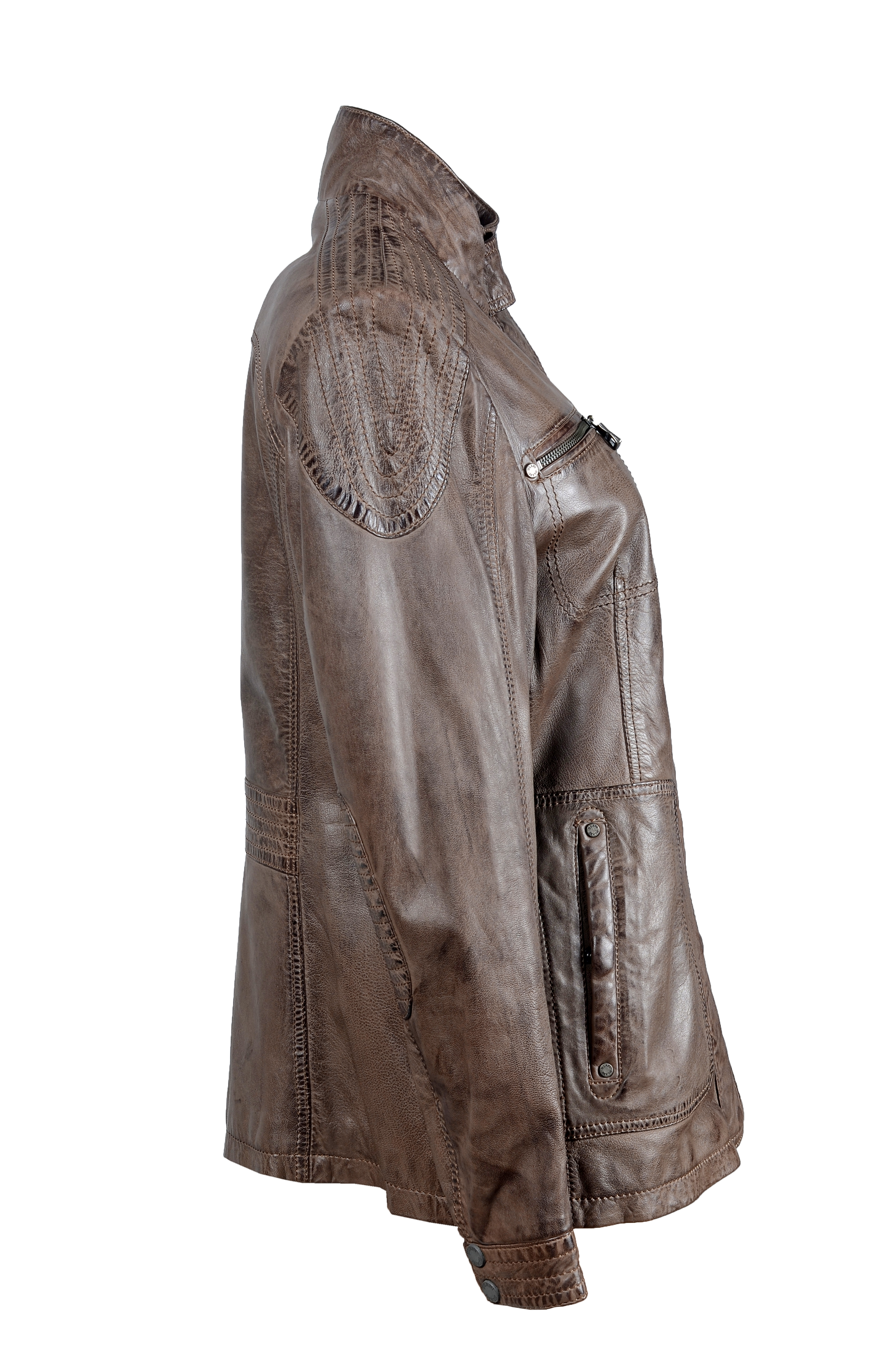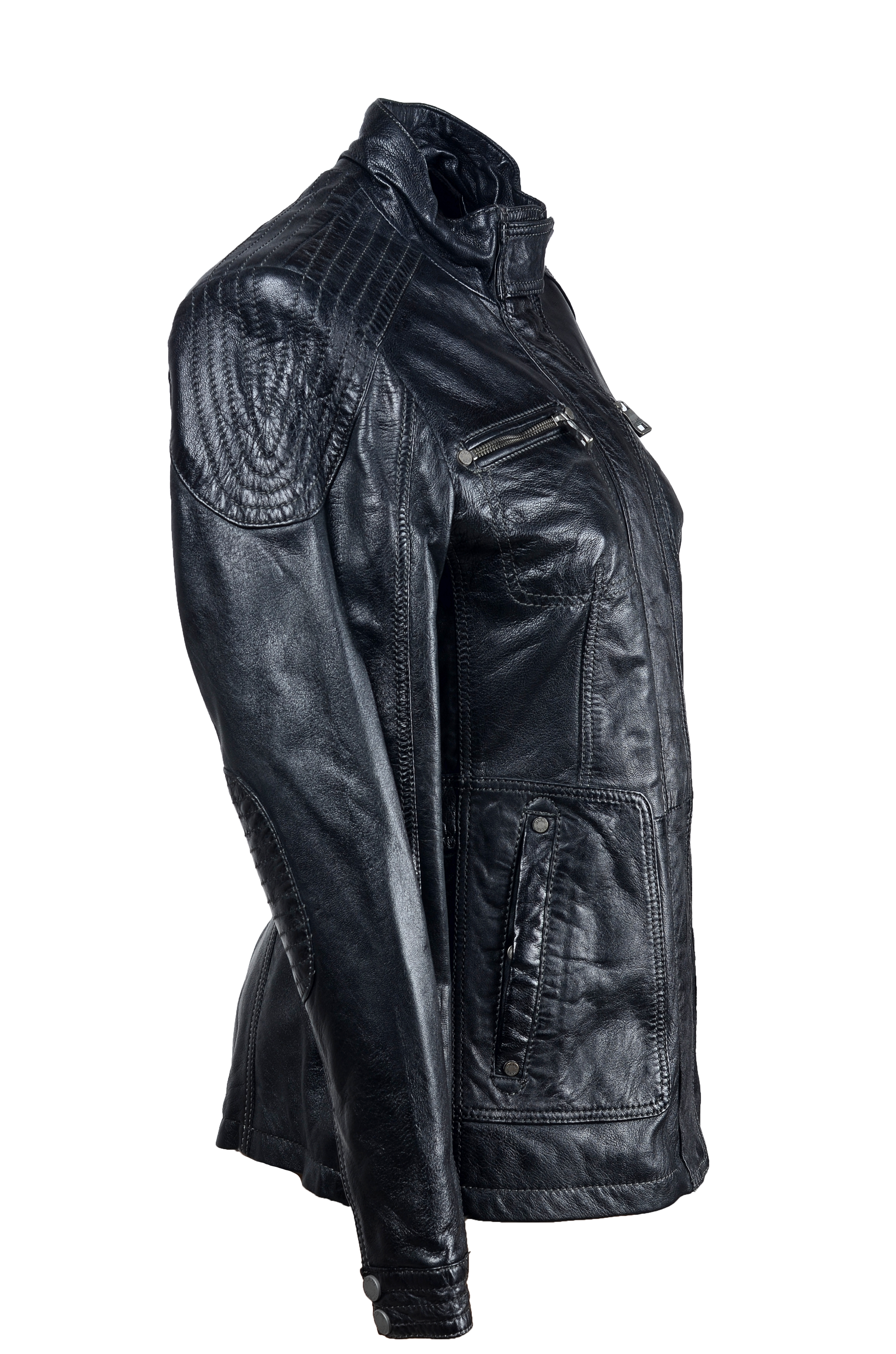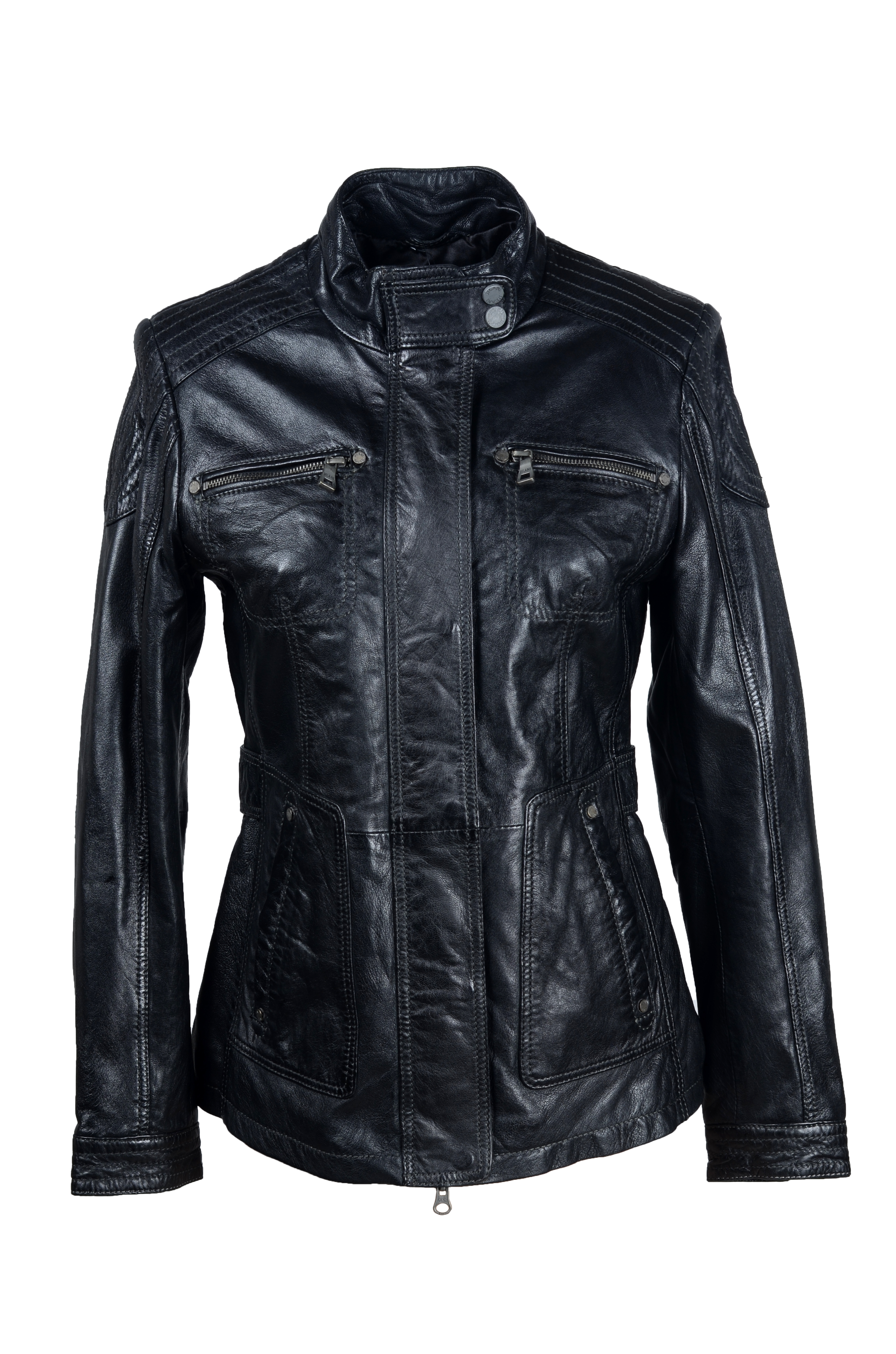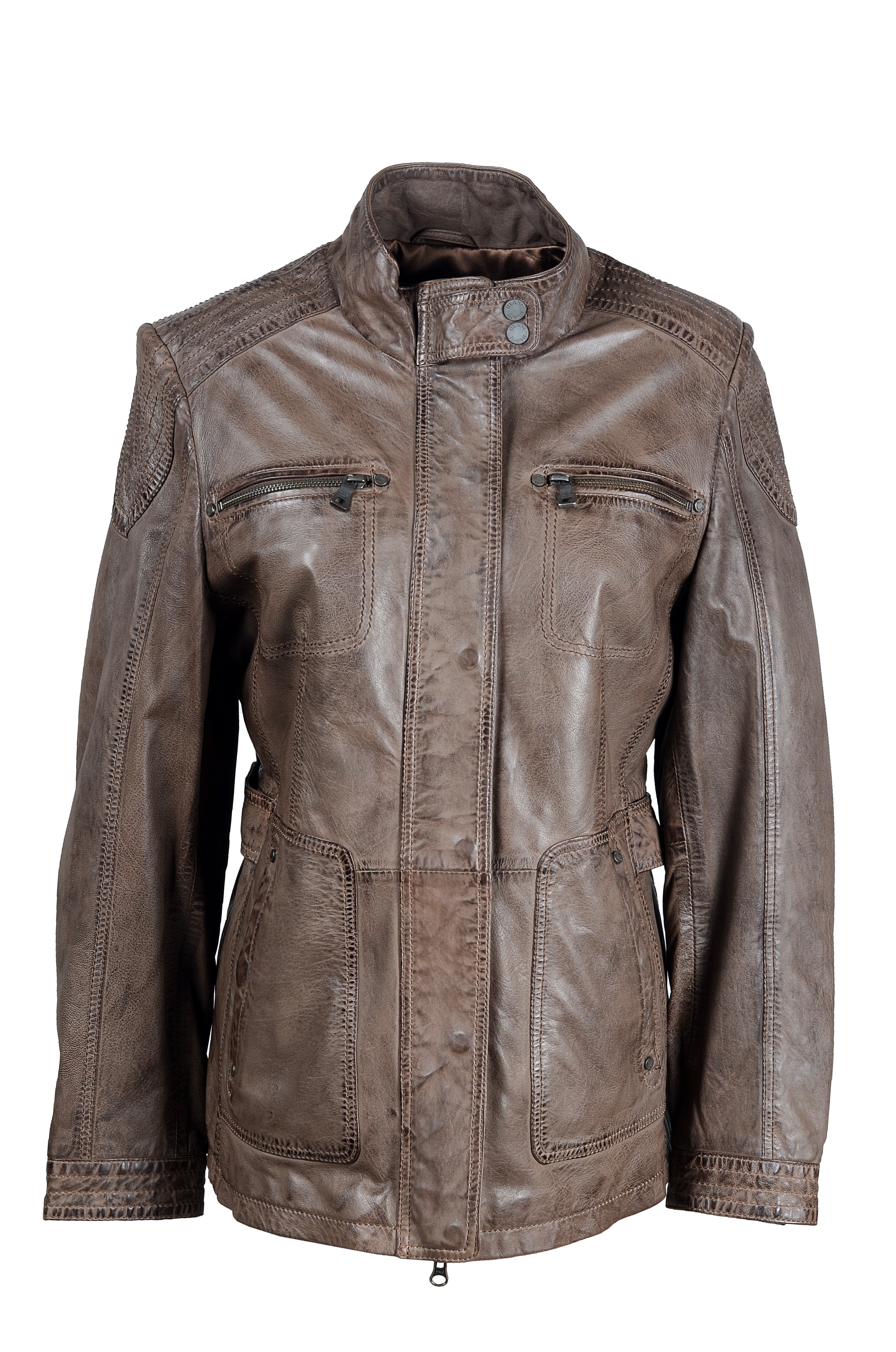 Rozměry:^vel. 46 - obvod hrudníku 106 cm, obvod pasu 96 cm, obvod boků 106 cm, délka 66 cm, délka rukávu 63 cm^Jedna vnitřní kapsička. Dvě vnější kapsičky na zip. Dvě boční kapsy na patent. Zapínání - zip, patenty. Velikost lze upravit patenty v pase - zadní díl. Patenty - manžeta rukávu, límec.