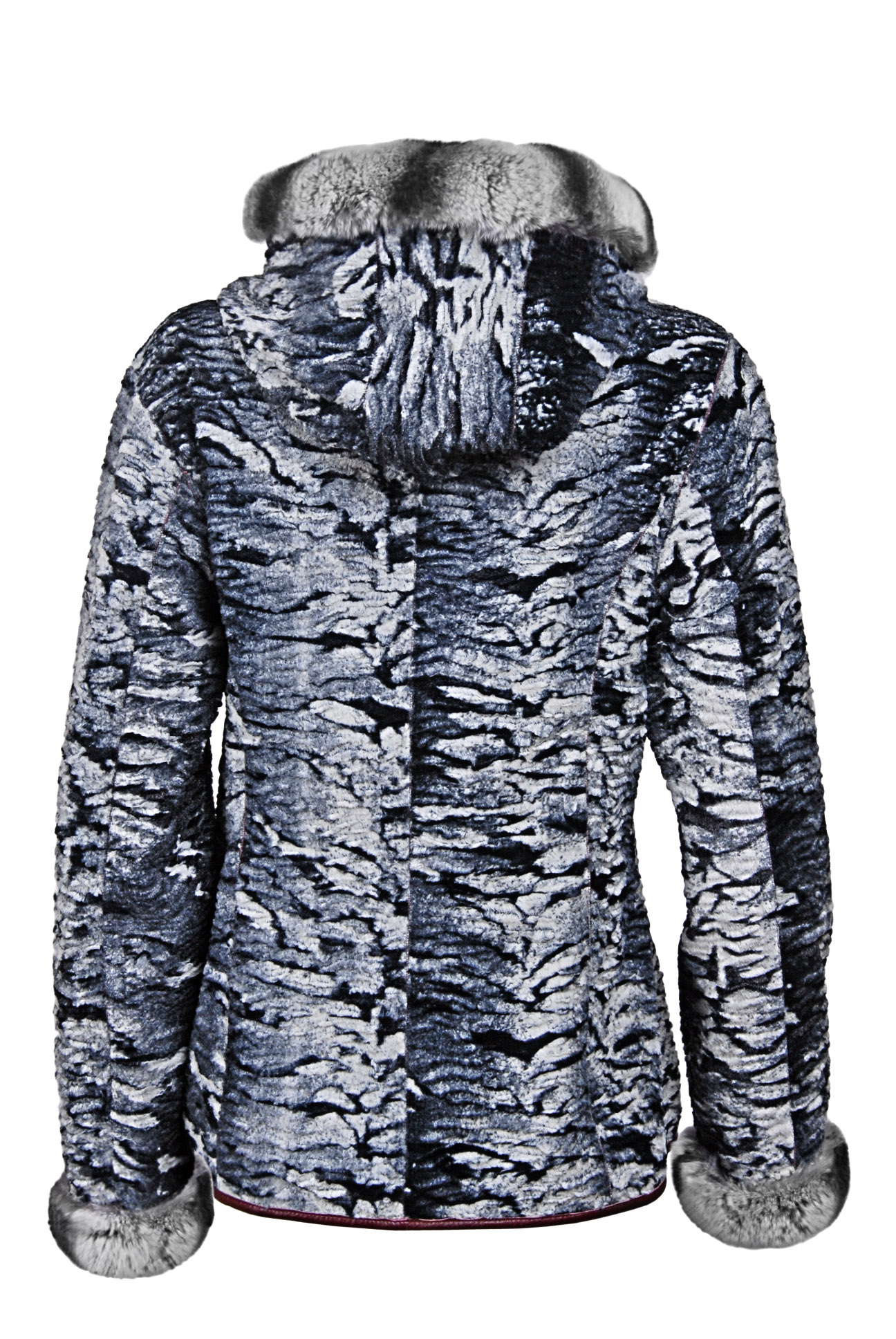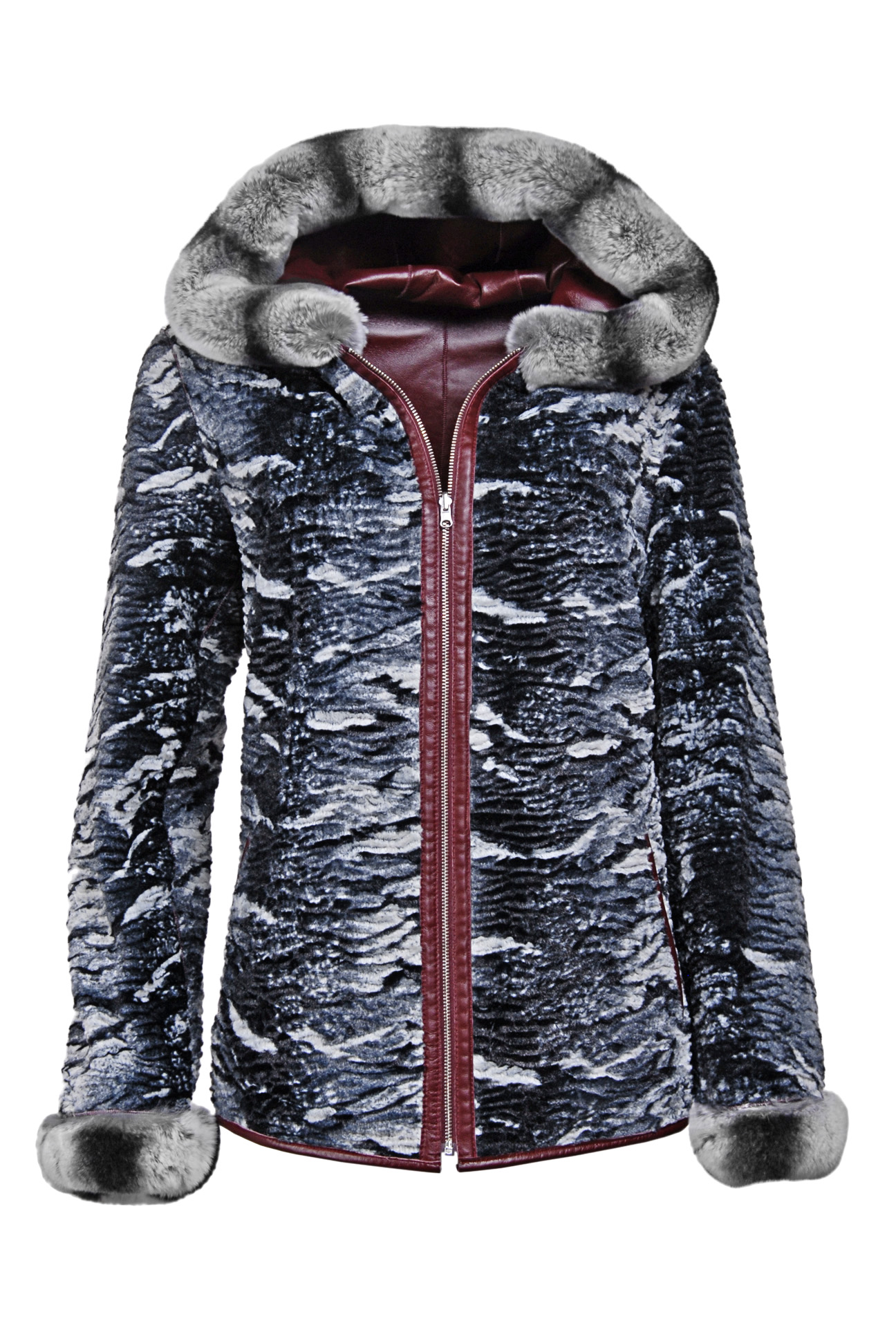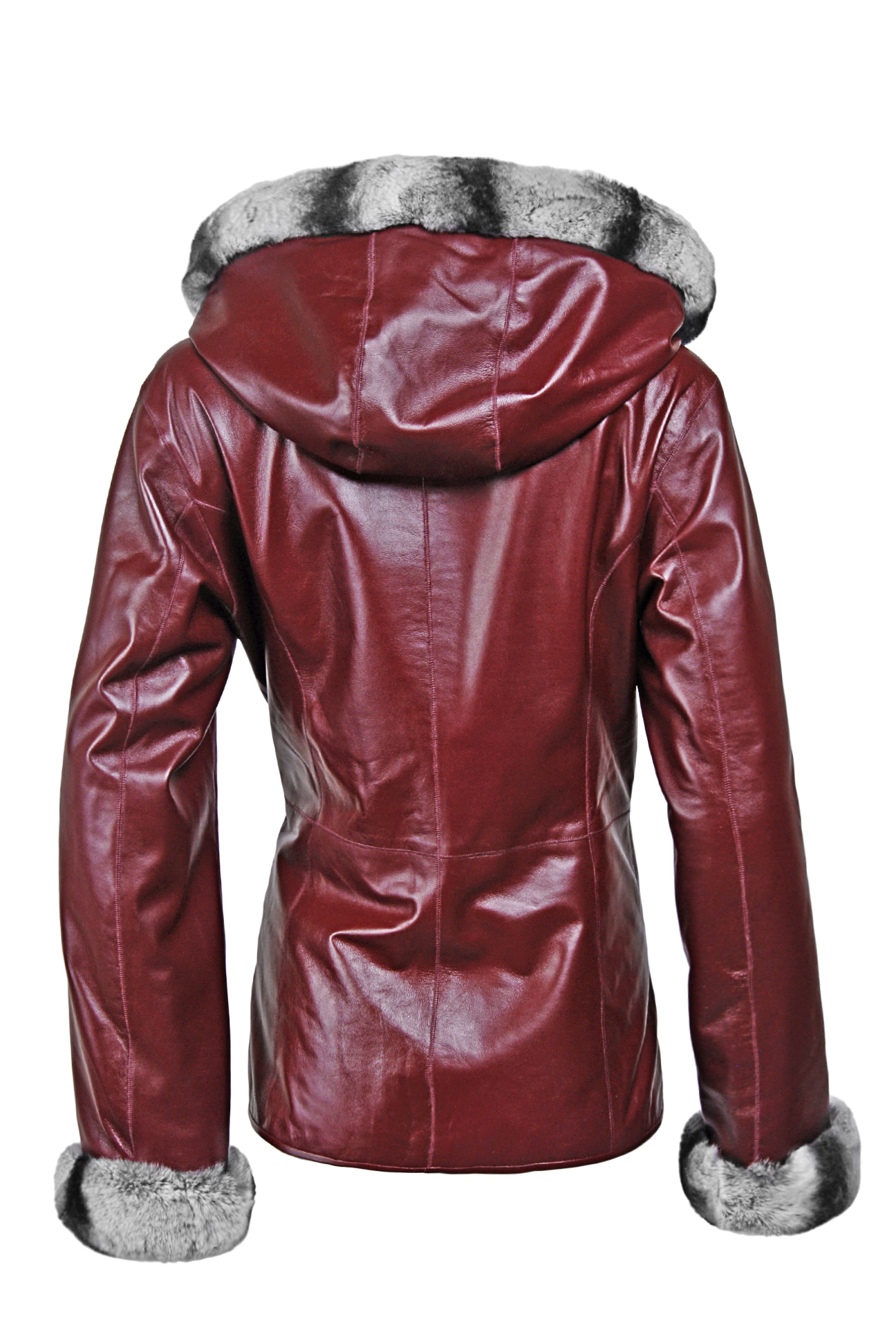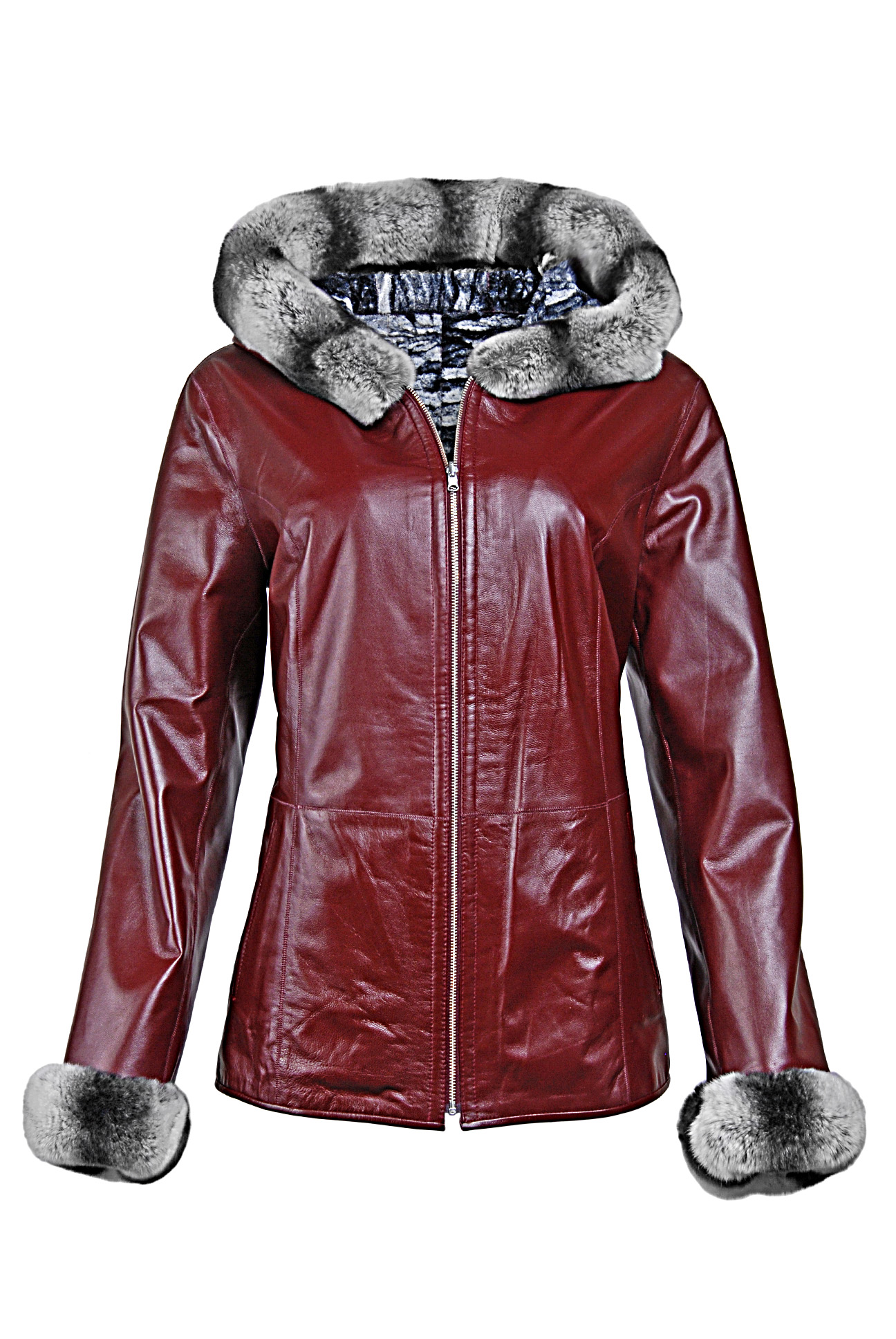 Rozměry:^vel. M - obvod hrudníku 94 cm, obvod pasu 84 cm, obvod boků 96 cm, délka 63 cm, délka rukávu 61 cm^vel. L - obvod hrudníku 100 cm, obvod pasu 92 cm, obvod boků 108 cm, délka 65 cm, délka rukávu 62 cm^vel. XL - obvod hrudníku 106 cm, obvod pasu 94 cm, obvod boků 110 cm, délka 65 cm, délka rukávu 62 cm^vel. 2XL - obvod hrudníku 114 cm, obvod pasu 106 cm, obvod boků 118 cm, délka 68 cm, délka rukávu 64 cm^Oboustranná dámská kožená bunda s králičí kožešinou na kapuci a rukávech. Na každé straně bundy dvě boční kapsy.